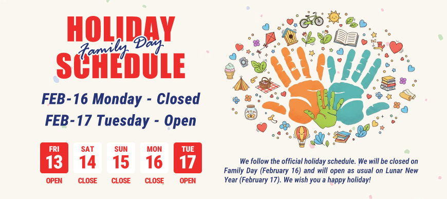 HOLIDAY SCHEDULE: 2026/2/16 Family Day - Closed